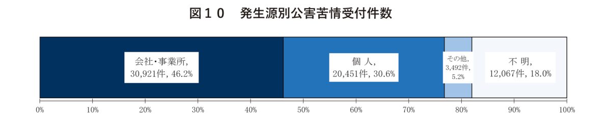 苦情の発生源として「会社・事業所」などが約半分を占め、次いで「個人」が約30%となっている。近年、工場などの会社による苦情が減少傾向にある一方で、一般家庭の生活音や異臭、マナーに起因する苦情は依然として多い。