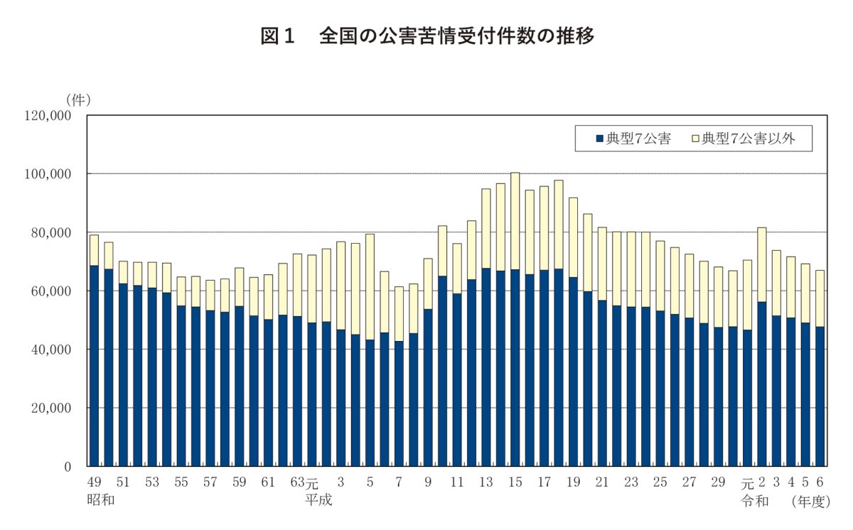 総務省の公害等調整委員会が発表している「令和6年度公害苦情調査」によれば、全国の公害苦情受付件数は年間約6万7千件にのぼる。